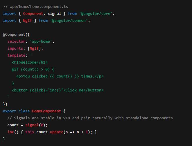 plus a small provider list is easier to reason about than app modules. (angular.dev) - Modern reactivity: Signals fit neatly into component state, making UI updates precise and predictable. (They’re part of the current, stable Angular stack.) (Angular Blog)