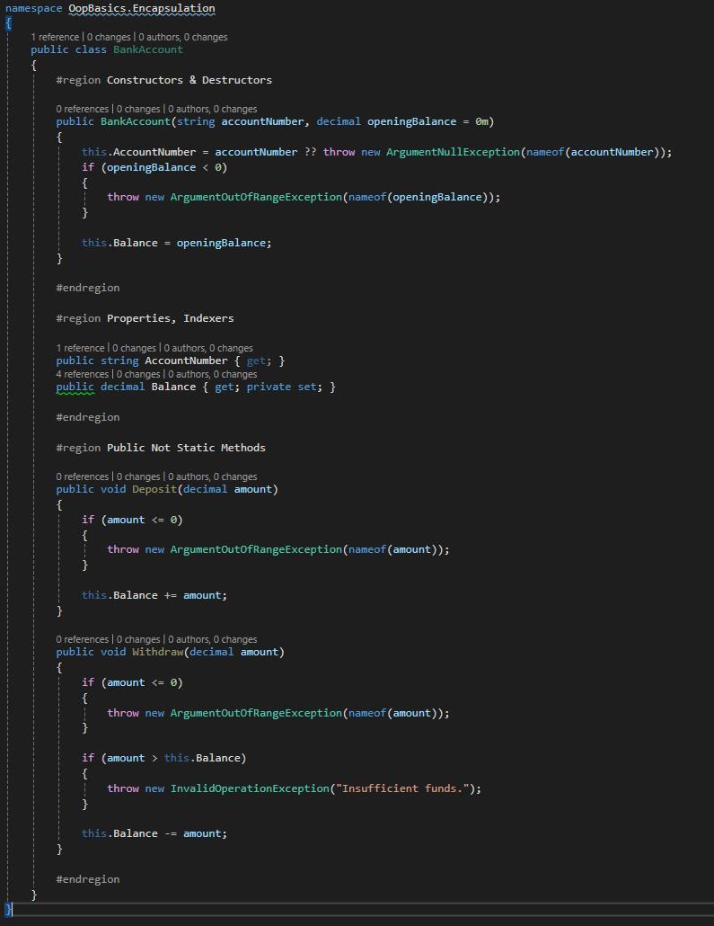 Encapsulation is the art of drawing the curtains: hide the data, present a calm, narrow interface, and guard invariants ruthlessly. In C#, that means access modifiers, properties with private setters, and methods that validate inputs. Encapsulation doesn’t magically make a system “secure”, but it dramatically reduces surface area for mistakes and misuse.