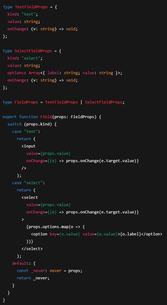 One literal key. Mutually exclusive shapes. Exhaustive by design.