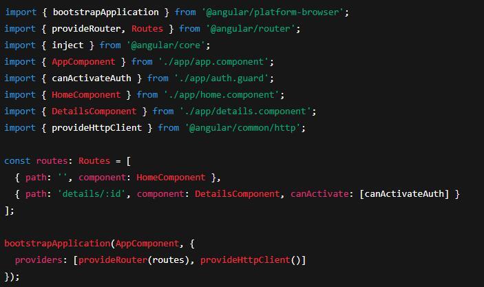 Declarative routes map URLs to standalone components, with guards/resolvers that can be written as