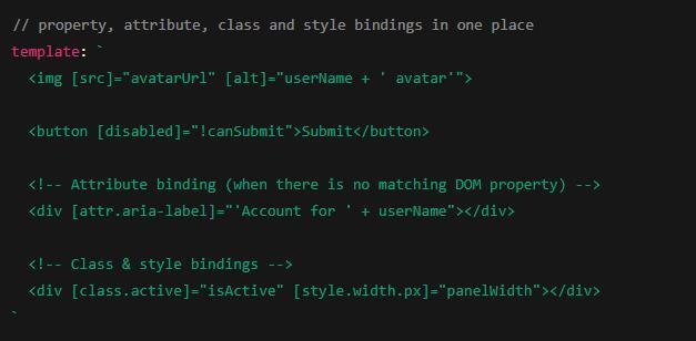 Version context: as of Angular v20 (current stable at the time of writing), these bindings and